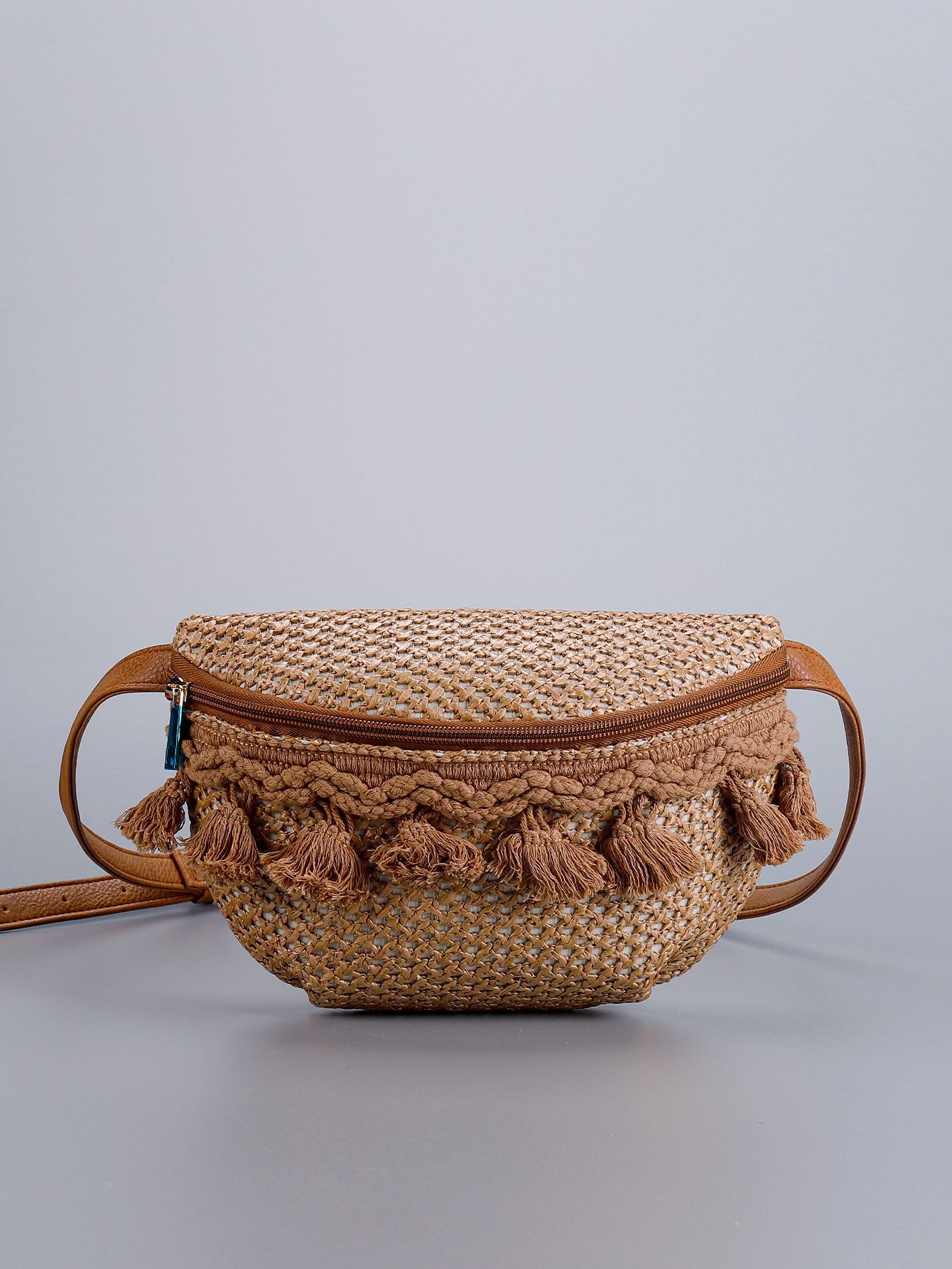 跨境款高级感草编斜挎包2025新款女包包欧美小众流苏编织腰包